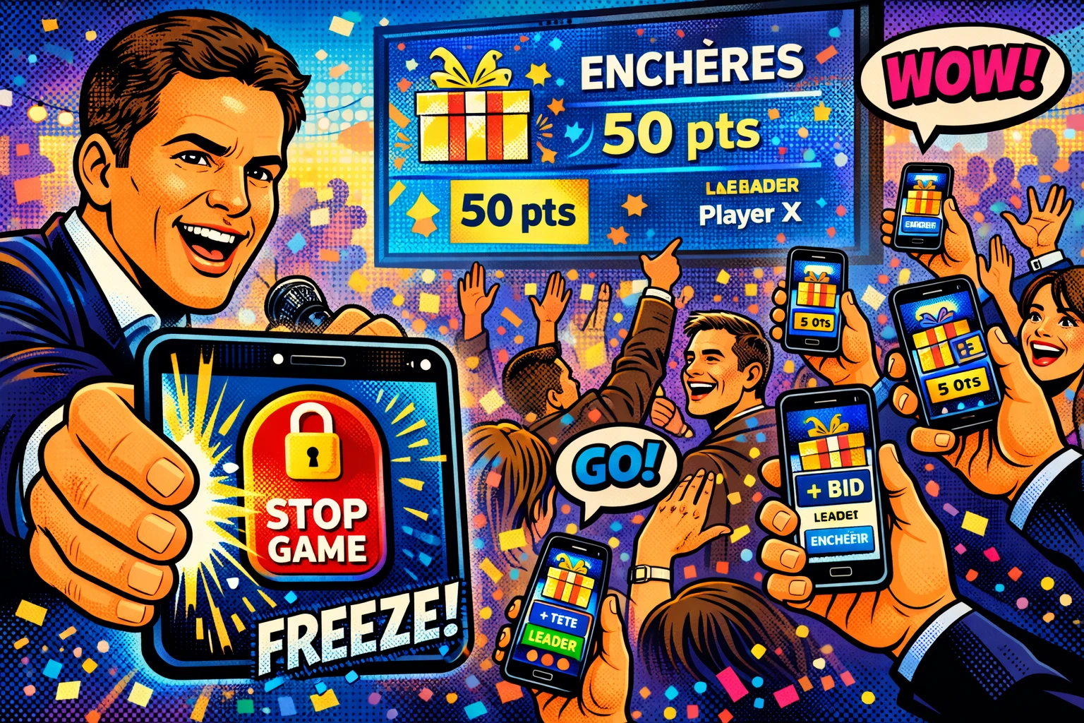 Et puis vient le moment que personne n'oublie : on stoppe tout d'un coup. Les scores se figent. Les points deviennent une monnaie et la salle bascule dans une vente aux enchères survoltée où chacun tente de repartir avec le cadeau convoité. Stratégie, bluff, éclats de rire… c'est le final parfait !