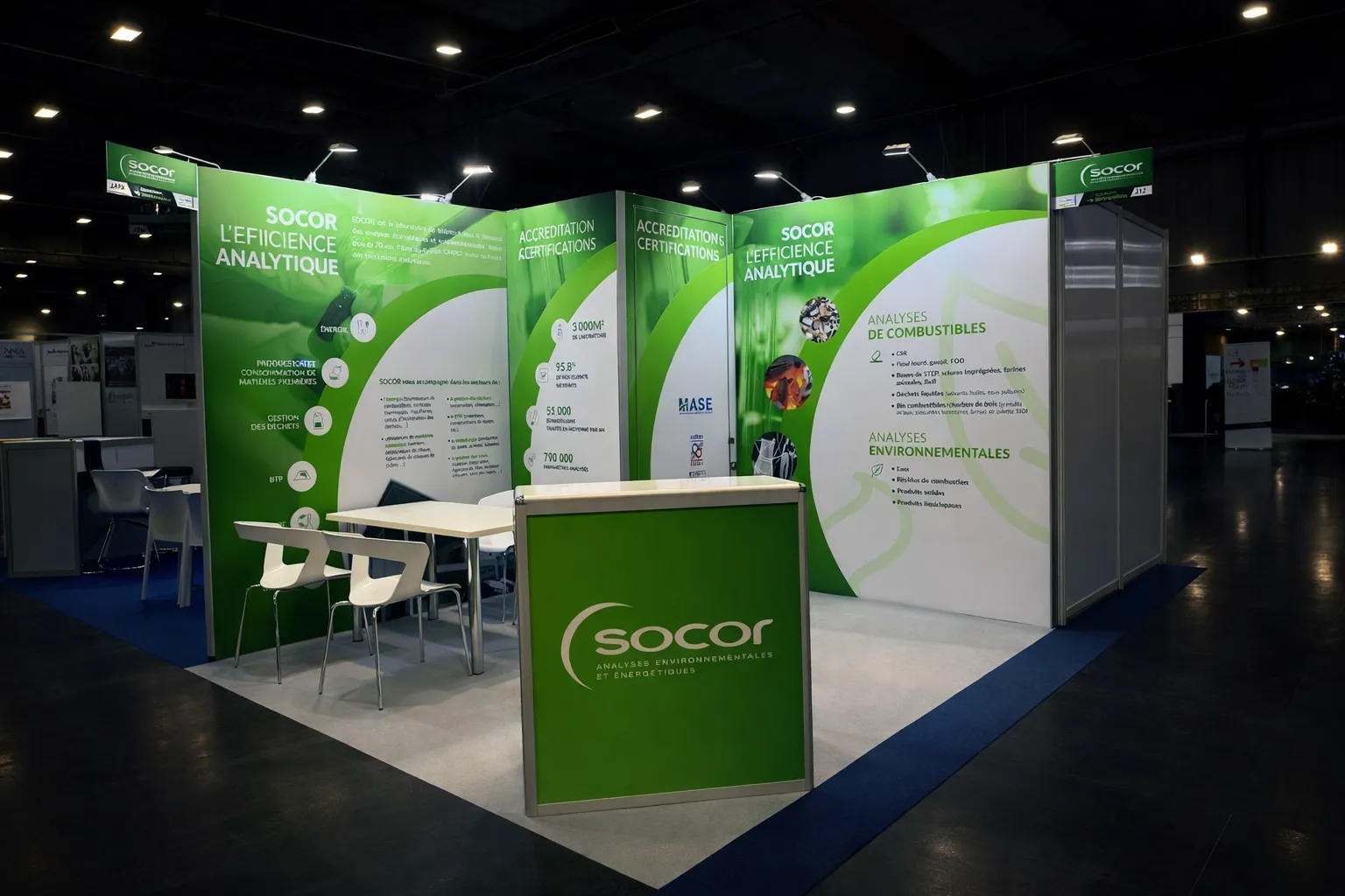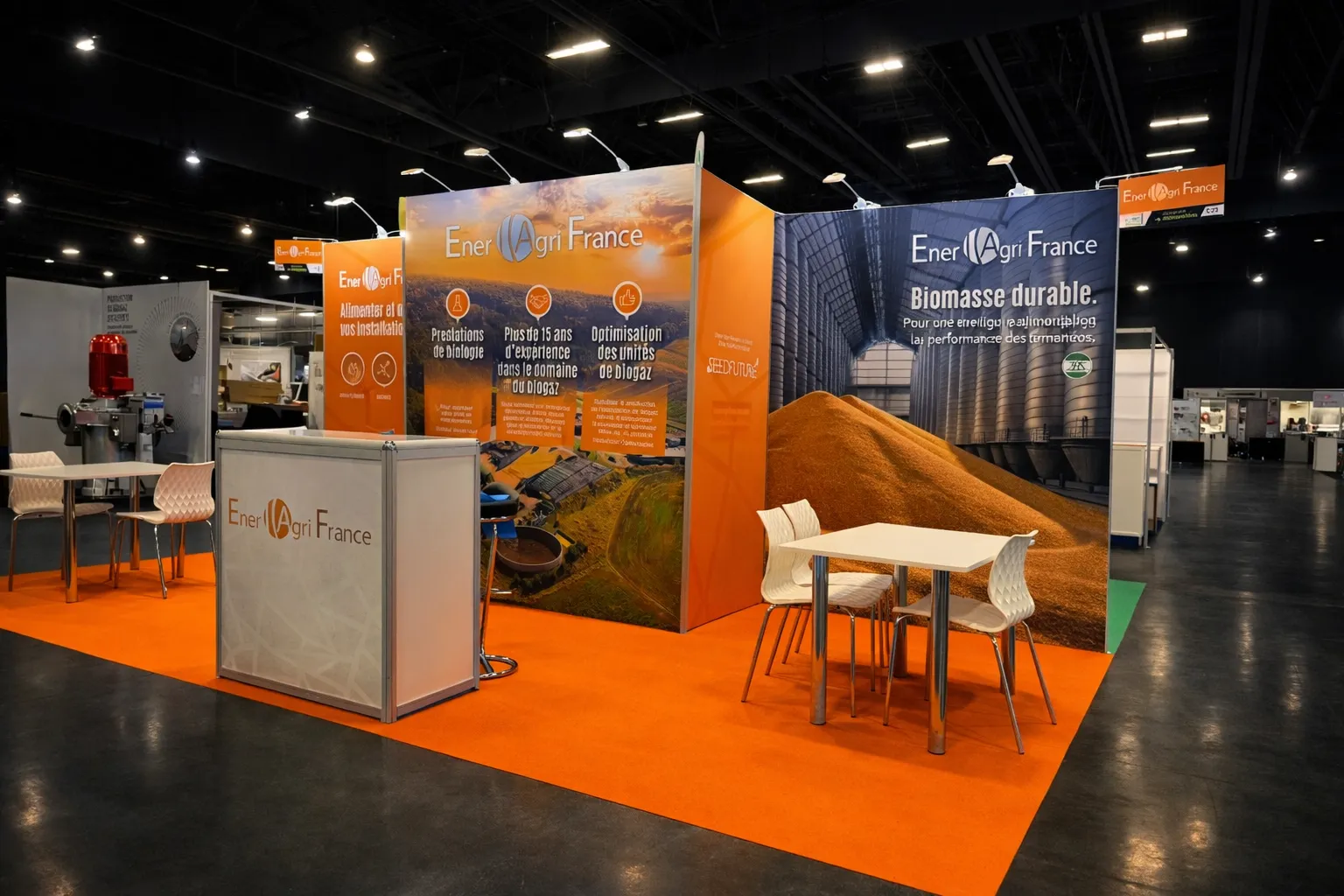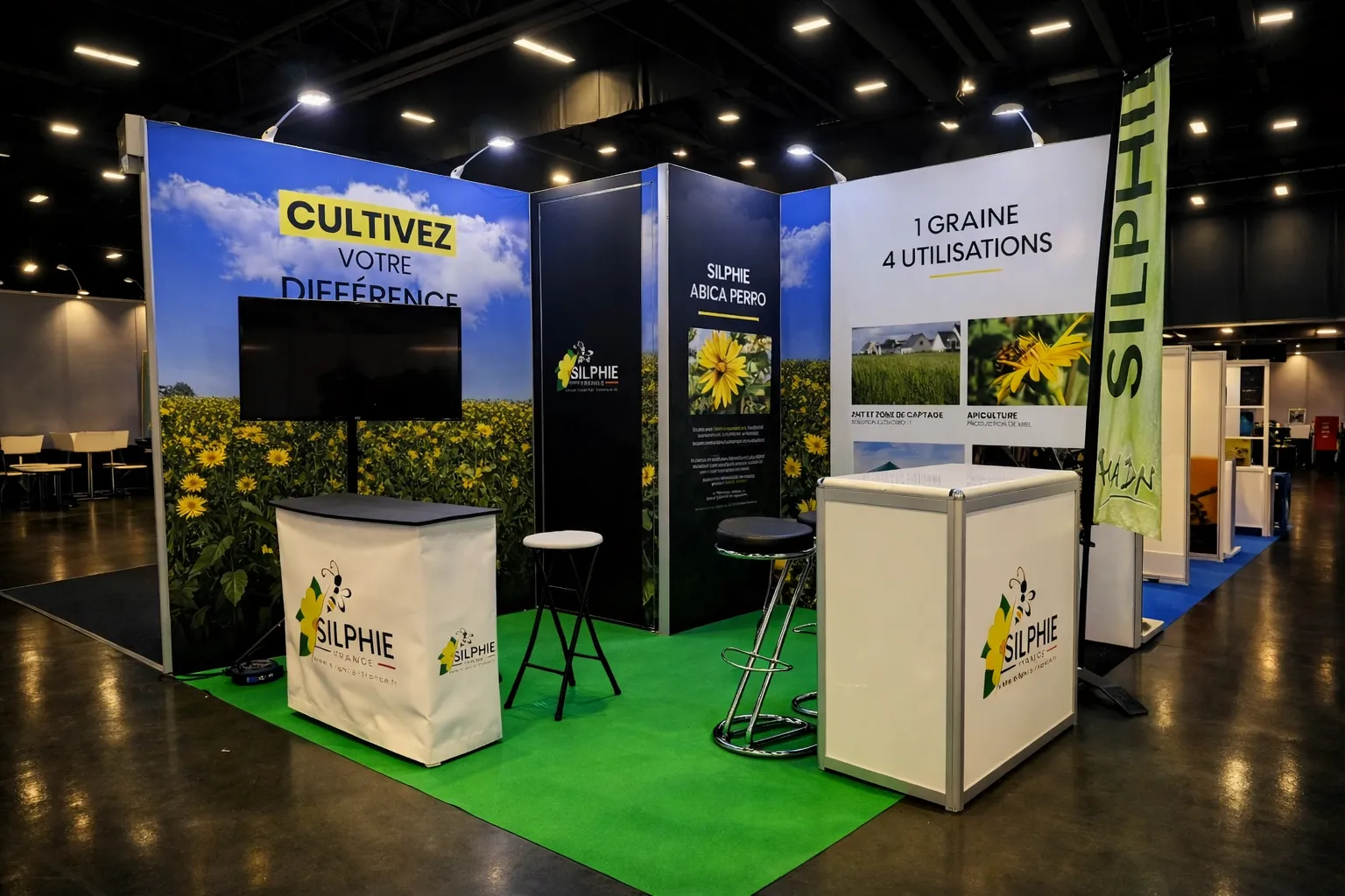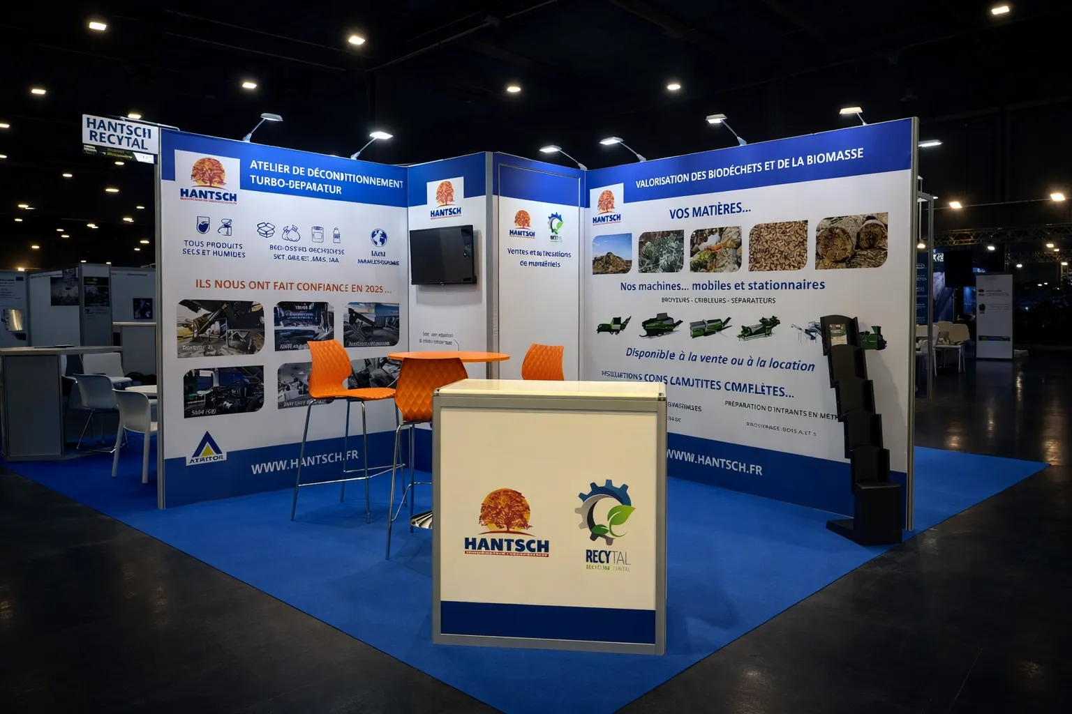 Chez iDkom, un stand clé en main, c'est une promesse de sérénité pour l'exposant. Notre équipe a piloté l'intégralité de la chaîne : relation client, direction artistique, production graphique, impression sur tissu grand format, assemblage des structures BeMatrix, intégration lumière et écrans, et aménagement des réserves. 38 exposants, 38 identités visuelles, un seul interlocuteur.