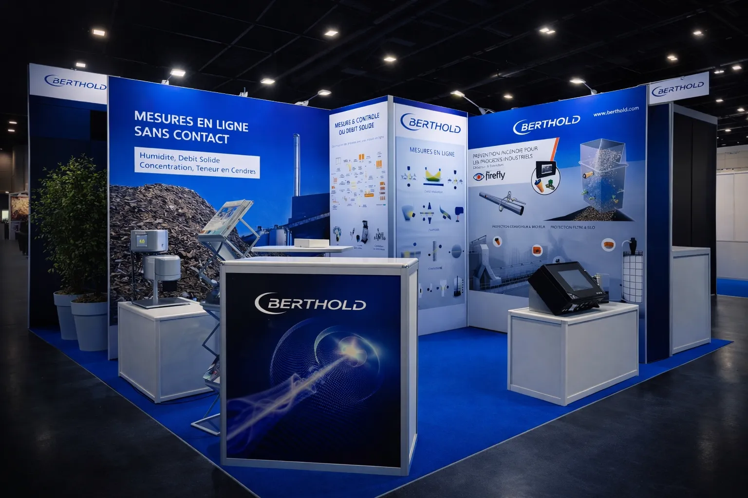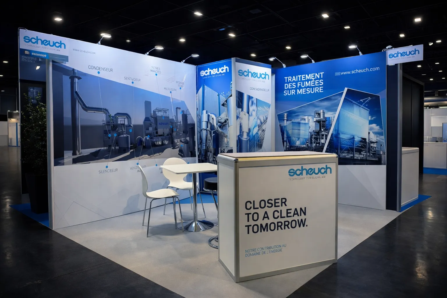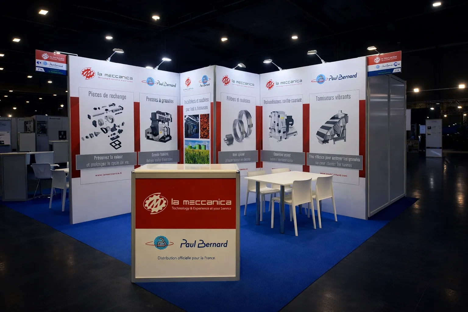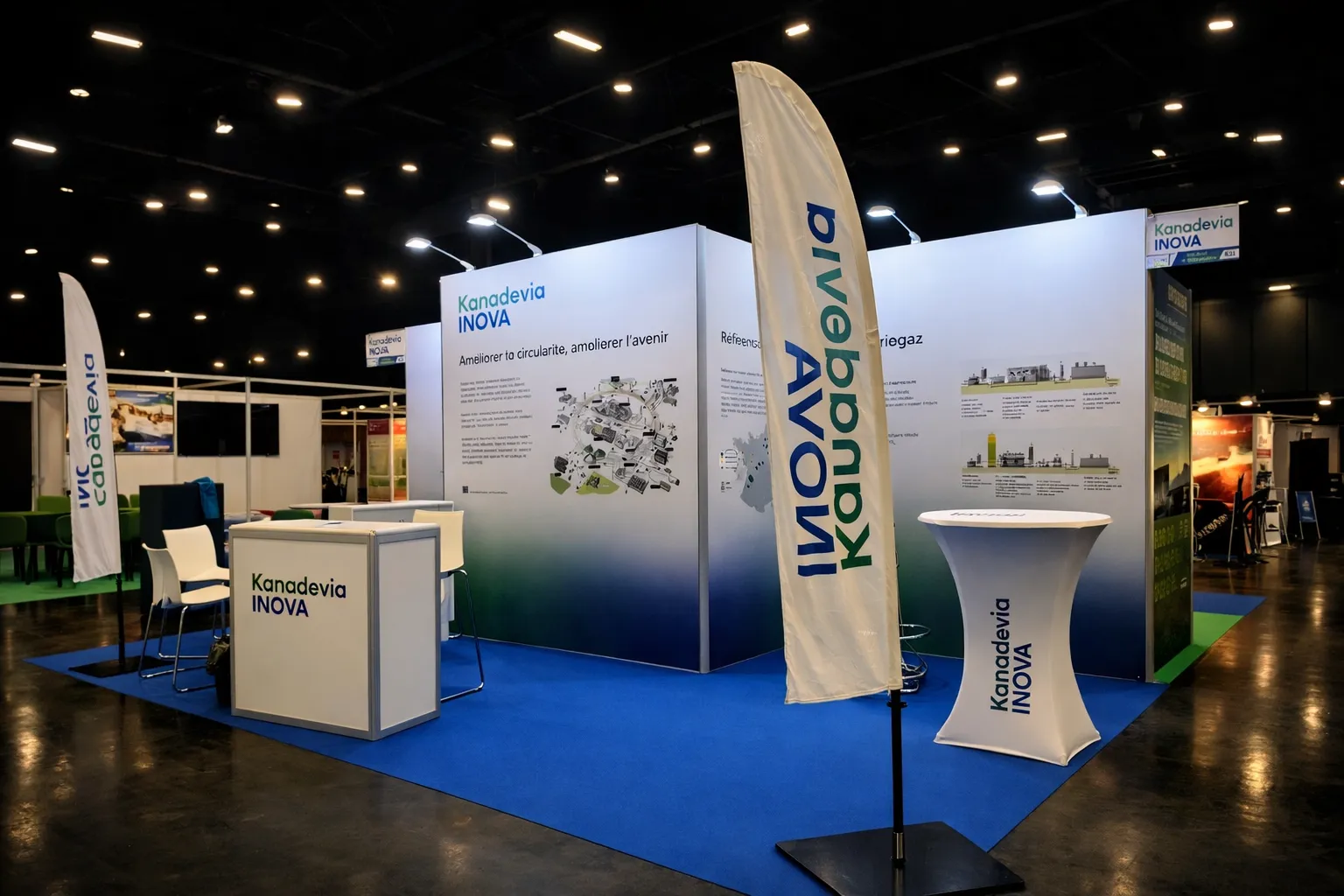 Chez iDkom, un stand clé en main, c'est une promesse de sérénité pour l'exposant. Notre équipe a piloté l'intégralité de la chaîne : relation client, direction artistique, production graphique, impression sur tissu grand format, assemblage des structures BeMatrix, intégration lumière et écrans, et aménagement des réserves. 38 exposants, 38 identités visuelles, un seul interlocuteur.