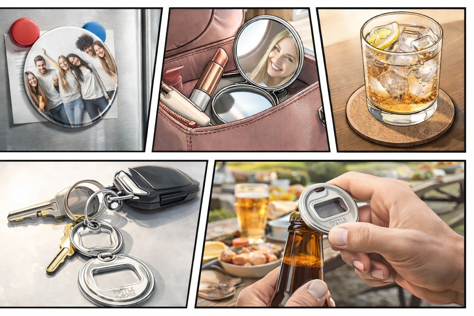 Plusieurs formats étaient proposés : • Magnet (frigo) • Miroir de poche • Dessous de verre • Décapsuleur aimanté (format plus petit) • Décapsuleur porte-clés (format plus petit)